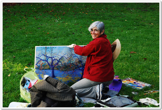 在舊金山的Golden Gate Park裡面,看到老奶奶悠閒地畫著彩色的夢