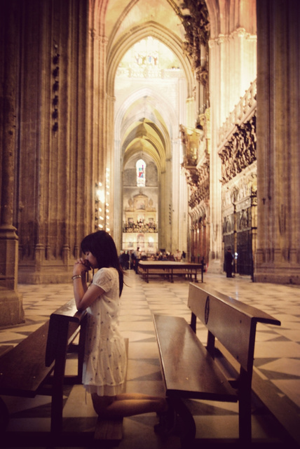 偌大的教堂裡迴盪著專注而無聲的祈求,